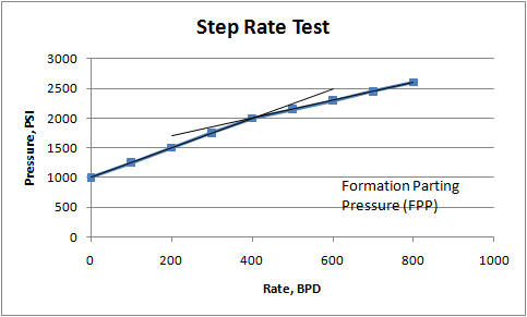 at is a “Step Rate Test (SRT)?”Injection rate and pressure are then plotted. The FPP occurs where the pre and post fracture pressures intersect: